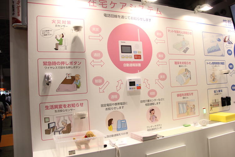 在宅ケアシステムのコーナーでは、徘徊お知らせ機器に、マットセンサーを踏むと知らせる「徘徊お知らせ お待ちくん」や設置したセンサーで知らせる「徘徊お知らせ 感知くん」、送信機を携帯した人がセンサーエリアに入ると知らせる「徘徊お知らせ けいたいくん」、シーツやマットレスの下にセンサーを敷く「ベッドセンサー(離床センサー)」などがありました。